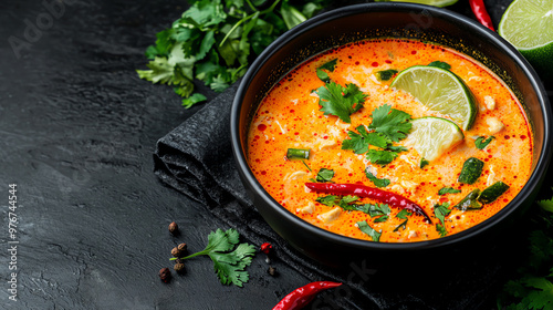 A vibrant bowl of creamy tomato soup with lime, cilantro, and red chili garnishes, perfect for a delicious meal.