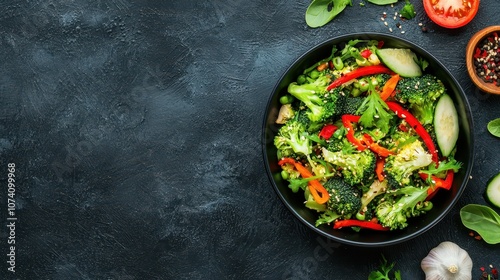 A vibrant bowl of fresh broccoli salad adorned with colorful peppers, surrounded by garlic, tomatoes, and greens on a dark textured surface.