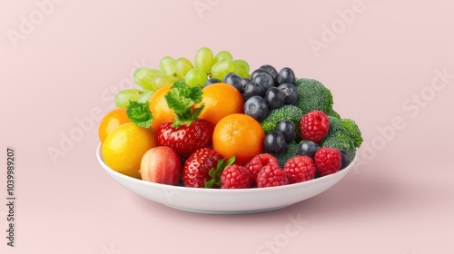 A vibrant bowl of fresh fruits, including strawberries, blueberries, grapes, and oranges, set against a soft pink background.