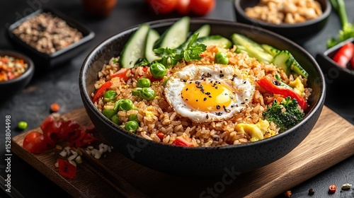 A vibrant bowl of fried rice features a sunny-side-up egg, nestled amongst colorful vegetables like peas, carrots, and broccoli, complemented by sliced cucumbers