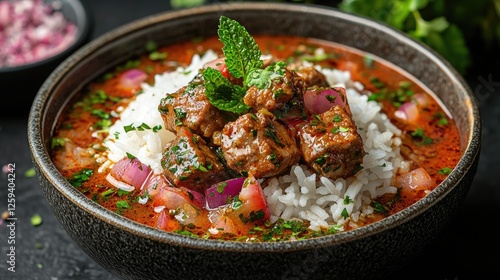 A vibrant bowl of rice topped with savory meat and fresh herbs, set against a dark background