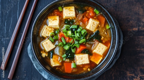 A vibrant bowl of tofu soup with colorful vegetables, garnished with green onions, served with chopsticks on a dark wooden surface.