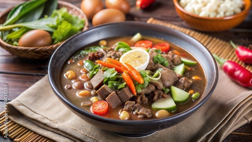 A vibrant bowl of traditional Asian noodle soup garnished with fresh vegetables, tofu, and a boiled egg, surrounded by ingredients like eggs, chili peppers, and leafy greens, showcasing a rich and app