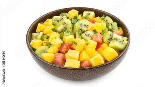 A vibrant bowl of tropical fruit salsa with diced mango, papaya, kiwi