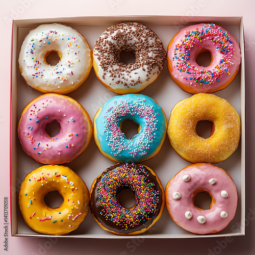 A vibrant box of assorted donuts with sprinkles, frosting, and cream filling, set against a soft pastel background. Perfect for food blogs, ads, and dessert branding