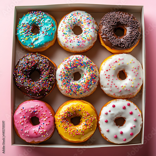 A vibrant box of assorted donuts with sprinkles, frosting, and cream filling, set against a soft pastel background. Perfect for food blogs, ads, and dessert branding