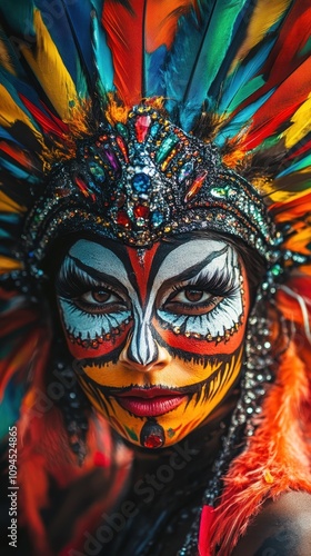 A vibrant Brazilian performer showcases elaborate face paint and festive feathers, radiating joy
