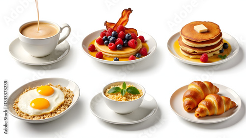 A vibrant breakfast collage with cappuccino, eggs, bacon, yogurt, pancakes, granola, and croissants. Styled with bright natural lighting for a fresh, colorful, and appetizing vibe.