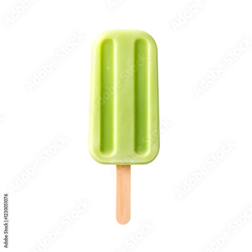 A vibrant, bright green Popsicle ice cream with a smooth, creamy texture and a partially unwrapped, crinkled paper wrapper, isolated on a transparent background with subtle gradient shadows, no reflec