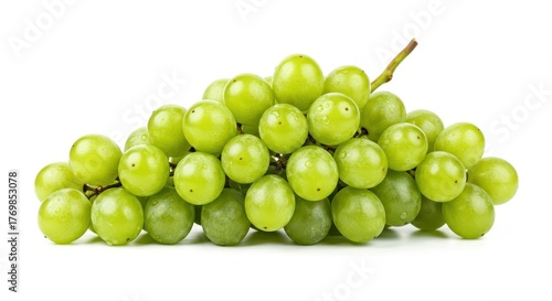 A vibrant bunch of crisp green table grapes, wet and fresh, lying horizontally isolated against a pure white background ,nobody ,Grapes ,crisp
