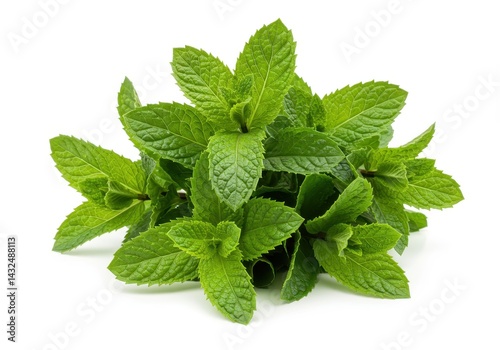 A vibrant bunch of fresh green mint leaves clustered together on a plain white surface background view