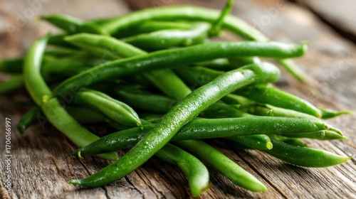 A vibrant bunch of freshly harvested green beans arranged on a rustic wooden surface, showcasing their glossy texture and natural green color. Ideal for healthy meals.