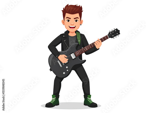 A vibrant cartoon man in a black leather jacket enthusiastically plays an electric guitar, embodying rock and roll energy.