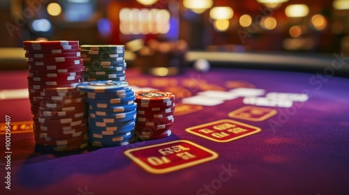 A vibrant casino poker table featuring colorful stacks of chips and betting cards during an evening gaming session. Generative AI