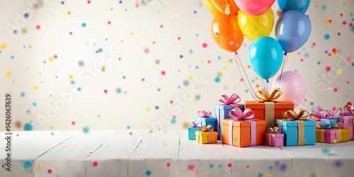 A vibrant celebration scene featuring colorful balloons and neatly wrapped gifts, set on a wooden surface with scattered confetti, evoking festive joy and excitement.