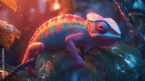 A vibrant chameleon perched on a branch in a lush green forest, illuminated by warm, golden sunlight.