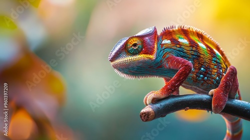 A vibrant chameleon perched on a branch, showcasing its colorful skin in a natural setting.
