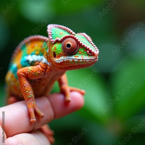 A vibrant chameleon perched on a hand, showcasing its colorful skin and unique features.