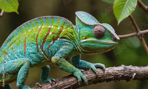 A vibrant chameleon perches on a branch, its scales shimmering in the sunlight