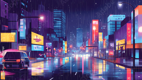 A vibrant city scene at night, featuring rain-soaked streets and illuminated signs. Rain-soaked Streets. Illustration