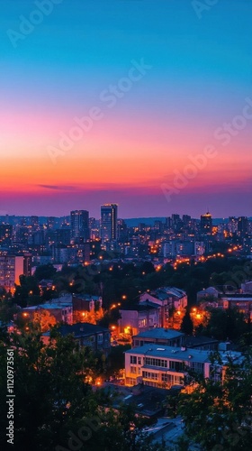 A vibrant city skyline at sunset, showcasing urban life and architecture.