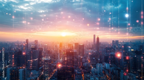 A vibrant city skyline at sunset with digital effects.