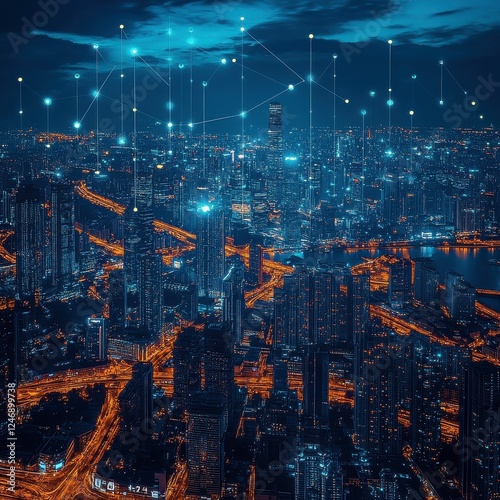 A vibrant cityscape at night, illuminated by orange lights and connected with digital network lines, showcasing a blend of technology and urban life.