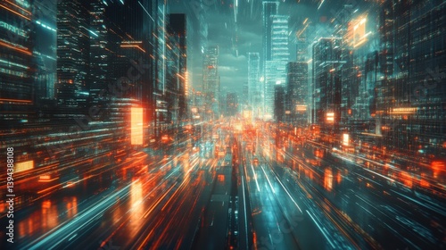 A vibrant cityscape at night, showcasing dynamic lights and tall skyscrapers, creating a futuristic and energetic atmosphere.