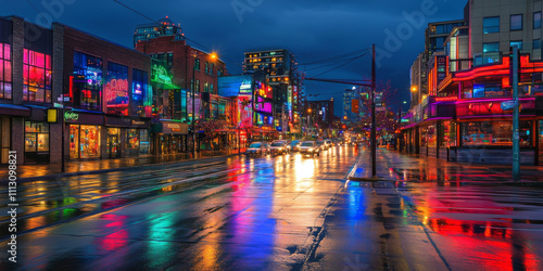 A vibrant cityscape at night with neon signs, busy streets, and reflections of lights in the wet pavement. The dynamic urban setting captures the energy of modern life.