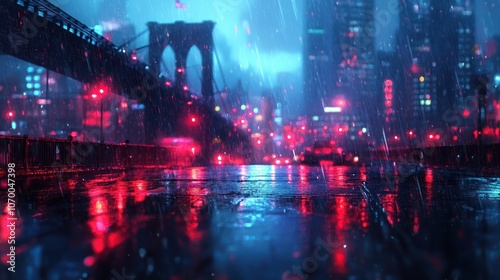 A vibrant cityscape under a heavy downpour, with a bridge silhouetted against the neon lights of the city.