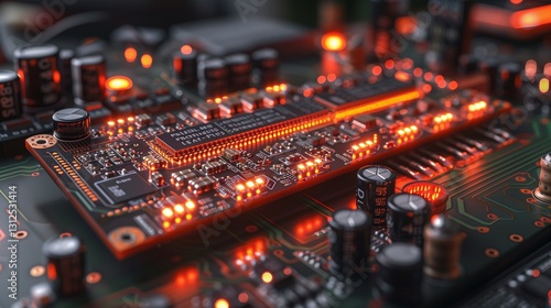 A vibrant closeup of a circuit board with glowing orange lights highlighting intricate electronic components and pathways