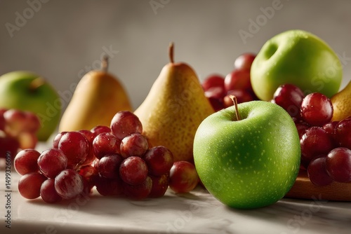 A vibrant close-up of a fresh fruit arrangement, showcasing green apples, ripe pears, and juicy red grapes, all artfully displayed on a smooth, neutral surface.