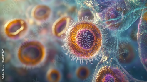 A vibrant close-up of colorful cellular structures, showcasing intricate details and textures on a blurred background.