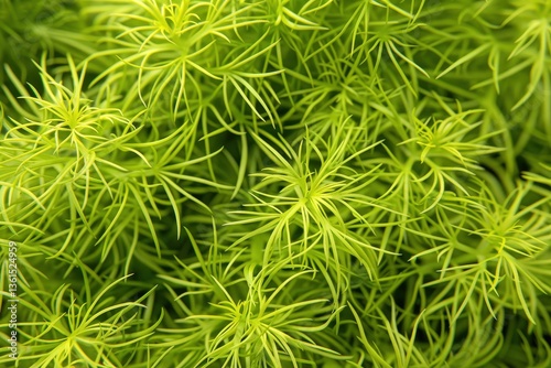 A vibrant close-up of lush, green foliage, showcasing intricate, needle-like leaves that create a dense, textured appearance.