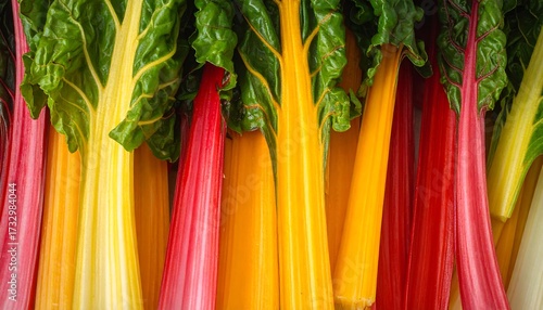 A vibrant close-up showcases colorful Swiss chard stalks and leaves, with hues of red, yellow, and green