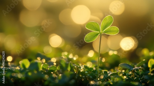 A vibrant clover leaf bathed in golden sunlight, amidst a lush green field.