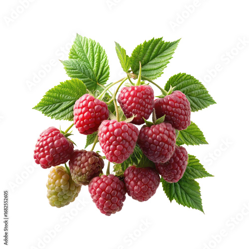 A vibrant cluster of ripe raspberries with fresh green leaves on white background