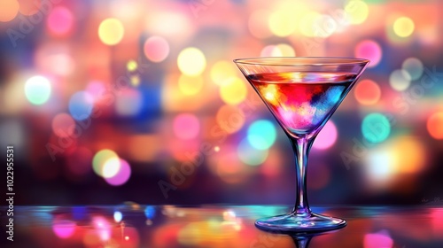 A vibrant cocktail glass against a colorful bokeh background, evoking a festive atmosphere.