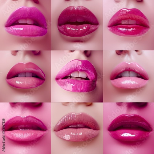 A vibrant collage of lips showcasing various shades of pink, from glossy to matte, This image is ideal for beauty brands, cosmetic ads, or makeup tutorials related to lip products,