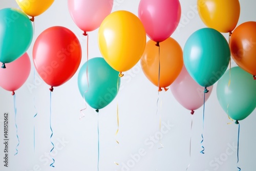 A vibrant collection of bright balloons, floating freely against a white background, symbolizing celebration.