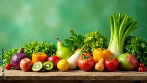A vibrant collection of fresh produce, showcasing a variety of colors and textures, arranged on a rustic wooden surface against a soft green background