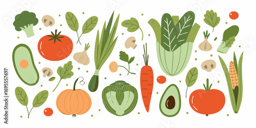 A vibrant collection of fresh vegetables and produce arranged in a decorative pattern on a white background