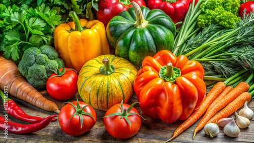 A vibrant collection of fresh vegetables is displayed, featuring a variety of peppers, tomatoes, pumpkins, and leafy greens, showcasing the harvest of the season