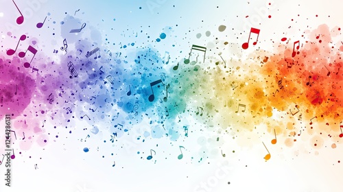 A vibrant collection of music-themed visuals, featuring abstract 3D instruments, colorful notes floating in dynamic compositions