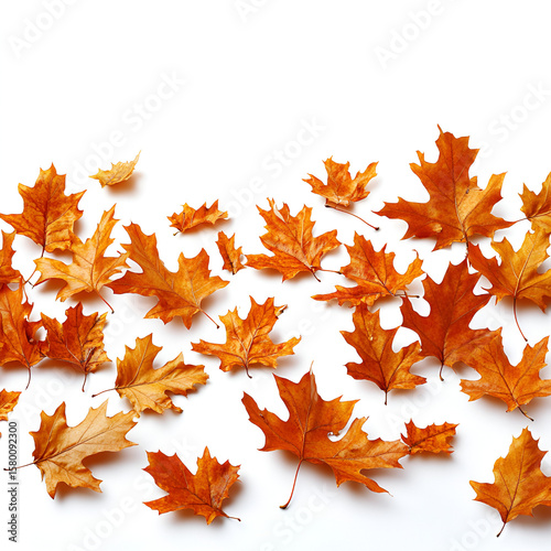 A vibrant collection of orange and yellow autumn leaves scattered across a clean white background, creating a seasonal border.