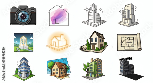 A vibrant collection of real estate and architectural illustrations, featuring various building styles, housing concepts, and urban development elements.