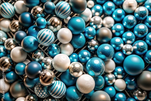 A vibrant collection of teal, silver, and white spheres creates a captivating visual experience filled with texture and depth, perfect for artistic design inspiration. Generative AI