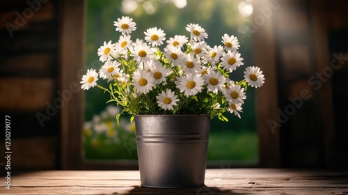 A vibrant collection of white daisies with yellow centers is arranged in a rustic metal bucket, set against a contrasting dark background, creating a beautiful floral display