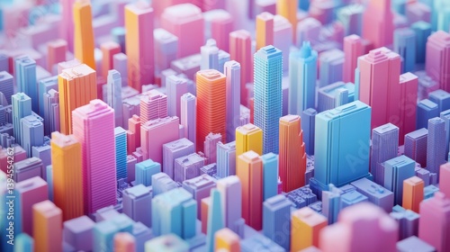 A vibrant, colorful cityscape model featuring various skyscrapers and buildings in pastel shades, showcasing urban architecture.