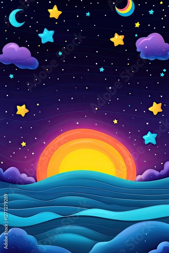 A vibrant, colorful sunset over the ocean with stars and clouds in the night sky.